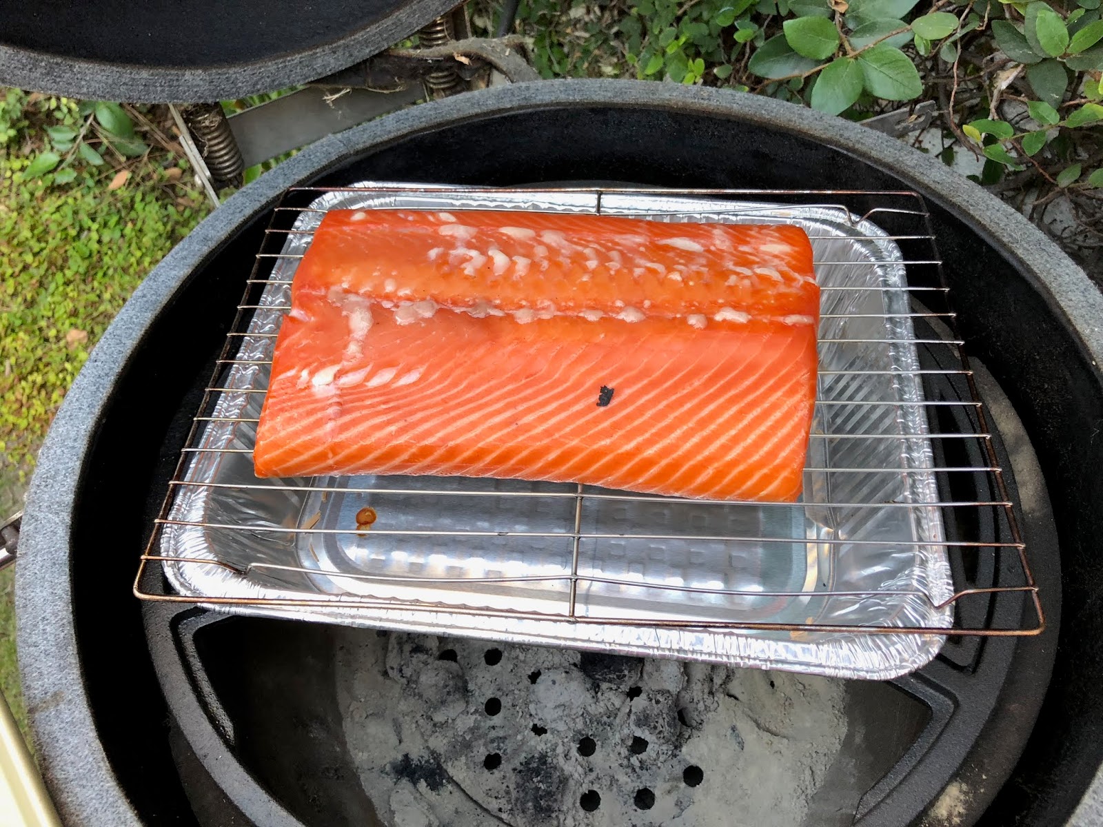We love smoked salmon. We smoke it at a very low temperature in the egg. We got a beautiful Copper River Salmon filet from McCall’s Meat and Fish. We used the recipe for Honey-Cured, Smoked Salmon from Cooking with Fire and Smoke by Phillip Stephen Schulz. You can find the recipe in our blog of: Jan 15, 2009. Click the date to get the recipe. This requires the salmon to be cooked low and slow in the egg.